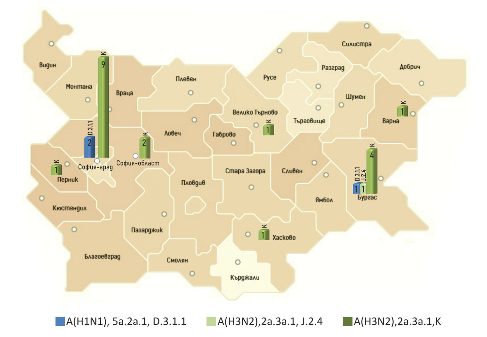 Разпространението на субтипове/клейдове/субклейдове на грипен вирус А в различни области на страната в периода ноември- декември 2025 г е представено в графичен вид (Фигура 1).