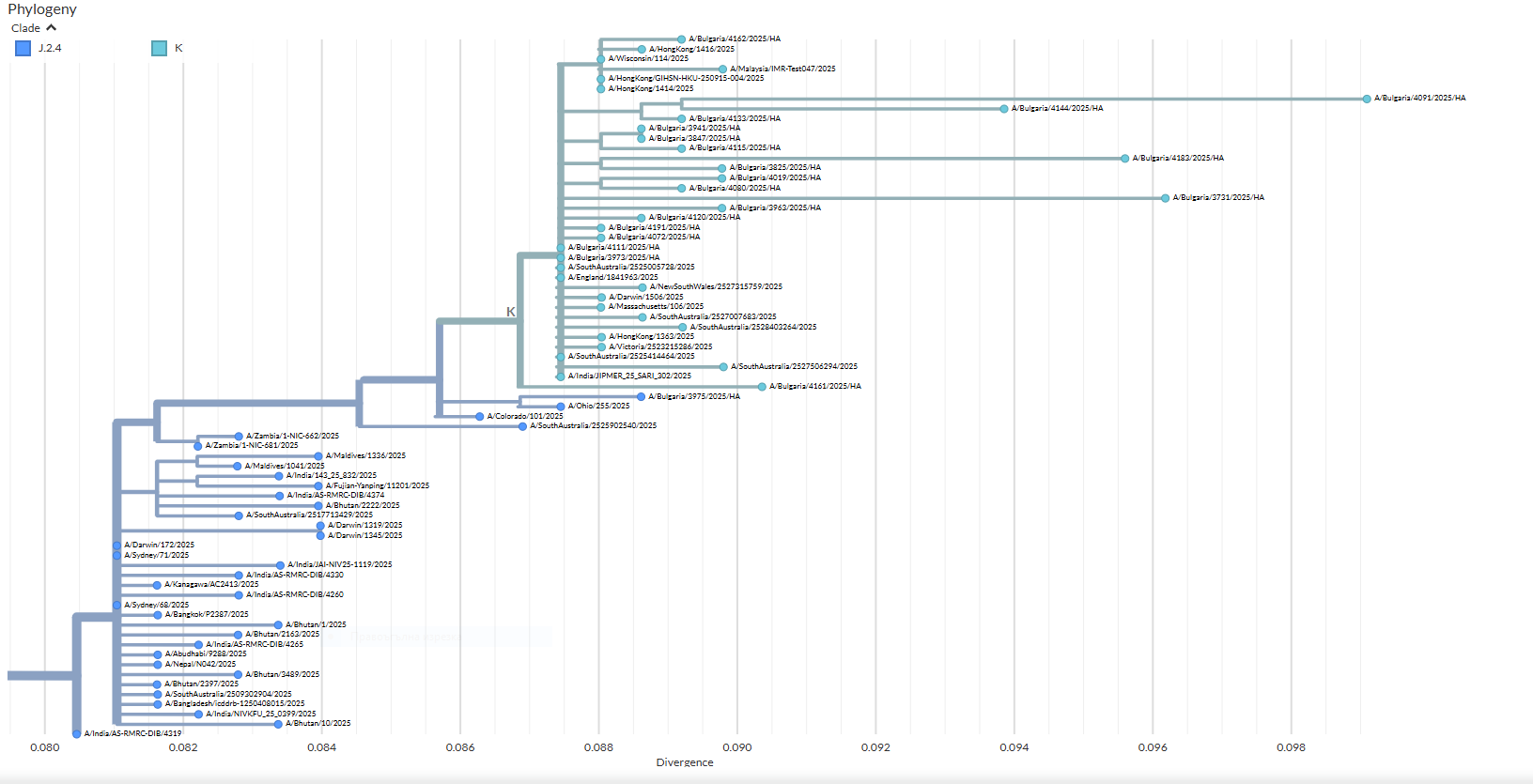 При всички секвенирани проби от субтип A(H1N1) бе установено, че се отнасят към клеид 5a.2a.1, субклейд D.3.1.1. Този субклейд е нов за страната и в предходния сезон не бе установен. При секвенираните проби A(H3N2) бе идентифициран „новият“ субклейд К (клейд 2a.3a.1) при 95% от пробите, докато при една от пробите бе доказан и сублейд J.2.4 (клейд 2a.3a.1). Подклад K (преди J.2.4.1) се превърна в доминиращ циркулиращ щам A(H3N2) в много части на света, включително ЕС/ЕИП и Северна Америка по време на грипния сезон 2025-2026.