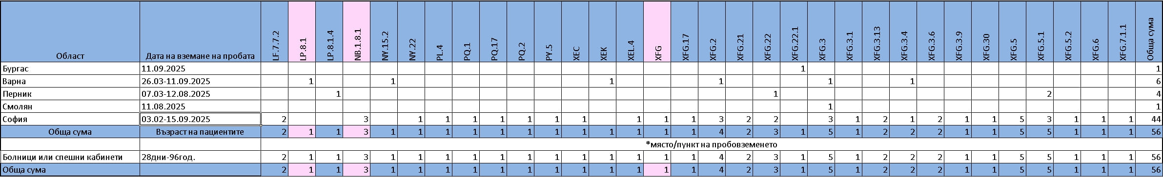 В НЦЗПБ чрез целогеномно секвениране от ново поколение успешно бяха анализирани 56 клинични проби със SARS-CoV-2. Пробите са взети от пациенти с COVID-19 от 5 области на страната в периода 03.02-15.09.2025г. и са изпратени от 5 лаборатории.