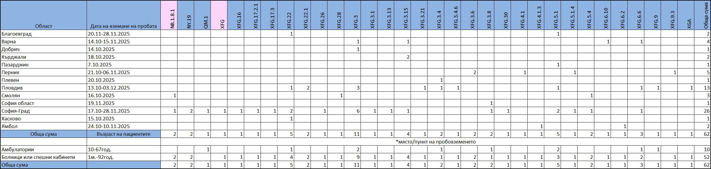*В таблицата е посочен броя на получените проби за секвениране от амбулатории и болнични заведения и техни спешни кабинети. Провежда се допълнително епидемиологично проучване.